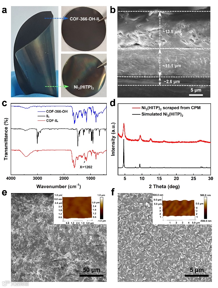 图2. CPM的表征。(a) CPM膜的照片图像。(b) CPM的横截面SEM图像。(c) COF-366-OH、IL和COF-366-OH-IL的傅立叶变换红外光谱。(d) Ni3(HITP)2的PXRD图谱。(e) CPM的COF-IL层的SEM图像(插入的是3D AFM图像)。(f) CPM Ni3(HITP)2层的 SEM 图像(插入的是3D AFM图像)。
