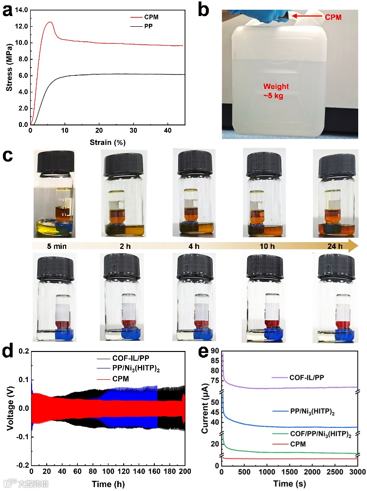 图3. CPM隔膜的表征和对称电池测试。(a) CPM膜和PP的应力-应变曲线。(b) CPM拉伸应力实验的照片(宽度,~2.8cm),水桶重~5kg。(c) PP(上图)和CPM(下图)的LiPS渗透测试。(d) 具有不同隔膜的对称电池的恒电流循环。(e) 不同隔膜的计时安培曲线。