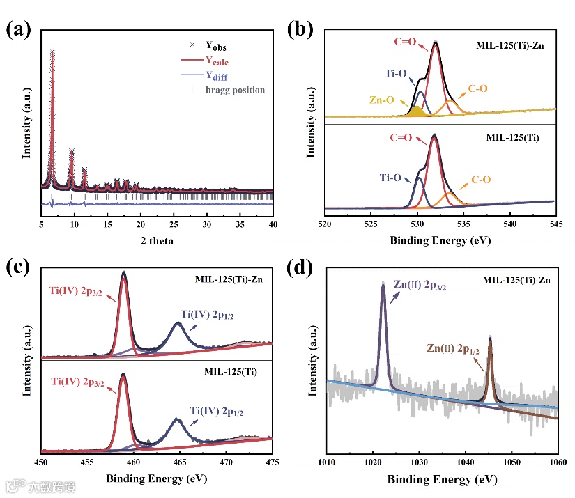 图2. (a) MIL-125(Ti)-Zn 的 XRD 曲线的 Rietveld 精修,观察到的强度(×号),计算的强度(红线),所有可能的反射峰的位置(竖线)以及计算和观察之间的差异强度(底部实线)。MIL-125(Ti) 和 MIL-125(Ti)-Zn 的 XPS 测量光谱:(b) O 1s、(c) Ti 2p 和 (d) Zn 2p。