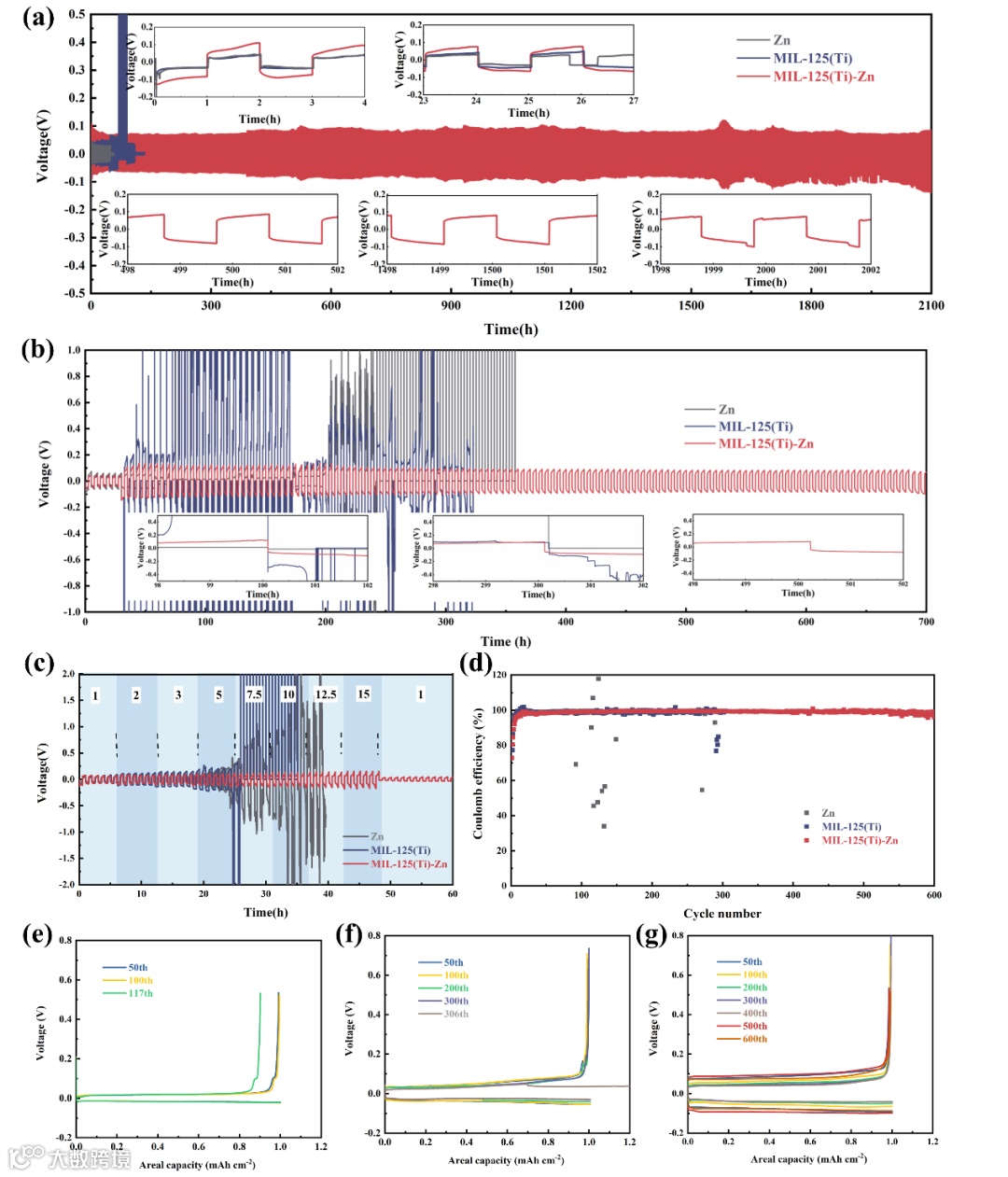 相比之下,MIL-125(Ti)@Zn对称电池的电压滞后在180h后增加,而裸锌电池产生的枝晶引起的内部短路导致了电池的失效,电压在45h后急剧下降。在5mA cm-2的电流密度下, MIL-125(Ti)-Zn@Zn对称电池仍能稳定循环长达近700小时(图4b)。MIL-125(Ti)-Zn@Zn对称电池的倍率性能也显示出稳定的电压曲线和较低的滞后电压(图4c)。组装MIL-125(Ti)@Zn-Cu电池,库伦效率达到99%以上(图4d),揭示了锌电镀/剥离的良好可逆性(图4d-g)。