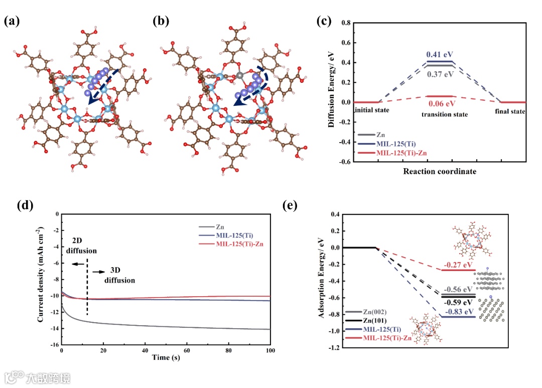 图5. Zn2+在 (a) MIL-125(Ti) 和 (b)MIL-125(Ti)-Zn 上的扩散路径示意图。(Ti、Zn、C、O 和 H 原子分别以蓝色、灰色、棕色、红色和白色显示, 插入的 Zn 原子以紫色显示。(c)Zn (001)、MIL-125(Ti) 和 MIL-125(Ti)-Zn 上Zn2+的扩散能垒图。(d) -150 mV 下 100 s内裸 Zn、MIL-125(Ti) 和 MIL-125(Ti)-Zn 上 Zn 成核的计时电流曲线。(e)Zn (001)、Zn (101)、MIL-125(Ti) 表面和 MIL-125(Ti)-Zn 表面吸附的Zn2+的吸附能 Ead。