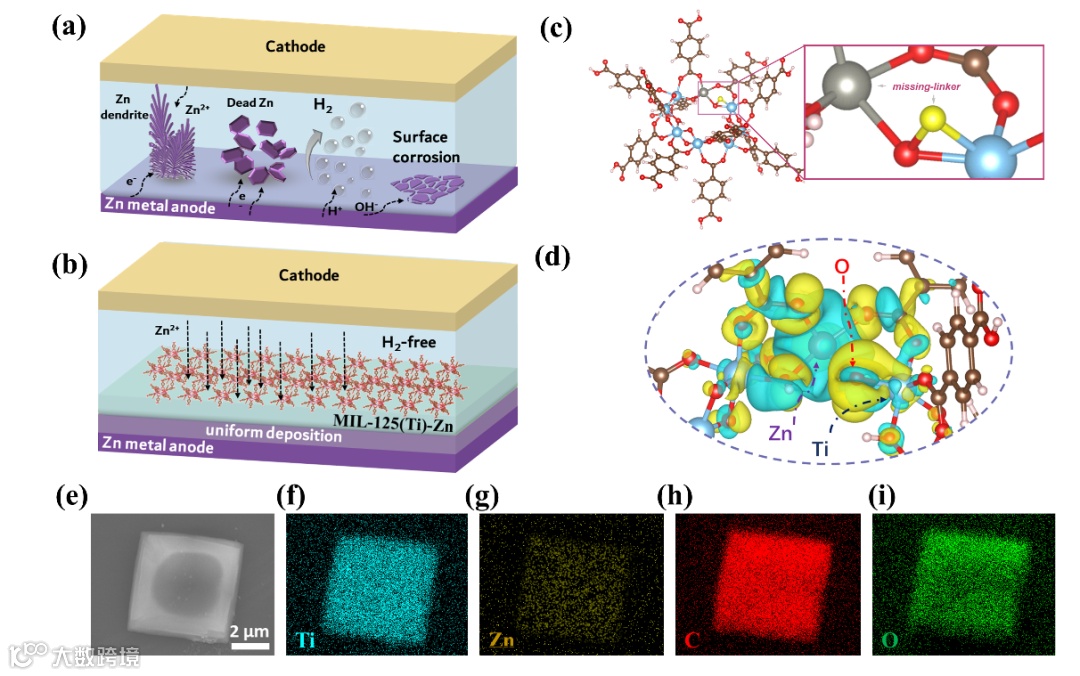 图1. (a) 裸锌金属负极 (b) MIL-125(Ti)-Zn@Zn 金属负极的锌沉积过程示意图。(c)缺失连接体的 MIL-125(Ti)-Zn 的示意图。棕色、红色、白色、黄色、蓝色和灰色球分别代表 C、O、H、缺失连接体 H、Ti 和 Zn 原子。(d) MIL-125(Ti)-Zn 的微分电荷密度分布。(e) MIL-125(Ti)-Zn的 SEM 和 (f-i) EDS 元素映射图像,其中Ti 元素(蓝色)、Zn 元素(黄色)、C 元素(红色)和 O 元素(绿色)。