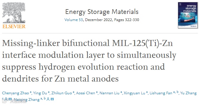Chenyang Zhao, Ying Du, Zhikun Guo, Aosai Chen, Nannan Liu, Xingyuan Lu, Lishuang Fan, Yu Zhang*, Naiqing Zhang*. Missing-linker bifunctional MIL-125(Ti)-Zn interface modulation layer to simultaneously suppress hydrogen evolution reaction and dendrites for Zn metal anodes. Energy Storage Materials, 2022, 53: 322-330.