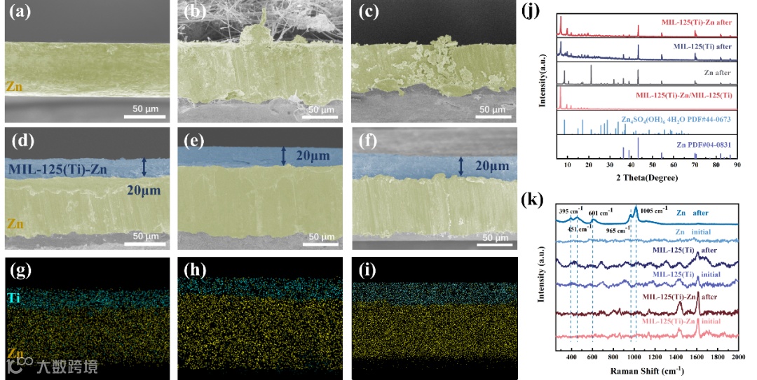 图3. SEM 照片:(a)裸锌和(d)MIL-125(Ti)-Zn@Zn负极,(b)裸锌和 (e)MIL-125(Ti)-Zn@Zn 负极在1mA cm-2下镀覆Zn的侧视图,在(c) 裸锌和 (f)MIL-125(Ti)-Zn@Zn 负极在1mA cm-2下剥离 Zn的侧视图。(g-i) MIL-125(Ti)-Zn @Zn 负极的 EDS 元素映射图像。(j) 循环后裸锌负极和 MIL-125(Ti)-Zn@Zn 负极的 XRD 光谱。(k) 裸锌负极和 MIL-125(Ti)-Zn@Zn 负极的拉曼光谱。