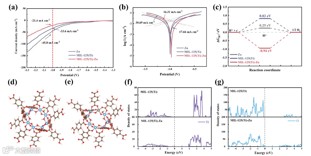 图6. (a) 不同样品在 2M Na2SO4水性电解质中的 LSV 曲线。对电极是 Pt,参比电极是 Ag/AgCl。(b) Zn、MIL-125(Ti)@Zn 和 MIL-125(Ti)-Zn@Zn 负极的Tafel曲线。(c) 计算得到的 Zn (001)、MIL-125(Ti) 和 MIL-125(Ti)-Zn 上 HER 的氢吉布斯自由能图。(d) MIL-125(Ti)、(e) MIL-125(Ti)-Zn 通过计算得到的 O 位点的氢吸附图像。计算得到的 MIL-125(Ti) 和 MIL-125(Ti)-Zn 中 (f) Ti 和 (g)O 的部分态密度 (PDOS)。