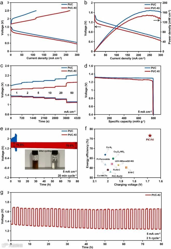 可以看到使用KI和Pt/C的锌空气电池,充电电压降低非常明显,能量效率也大大提升。同时,电池的放电电压也维持在一个平稳且较高的水平。在循环测试中,若不使用KI,锌空气电池性能不到10小时便迅速衰减,这是因为较高的电压导致严重的Pt/C电极碳腐蚀。而使用KI可较好的保护Pt/C电极,因为较低的充电电压并不会对Pt/C造成损害,80小时循环充放电后电池性能并无明显衰减。电解液的颜色变化也更加验证了低充电电压对Pt/C碳腐蚀的缓和作用。