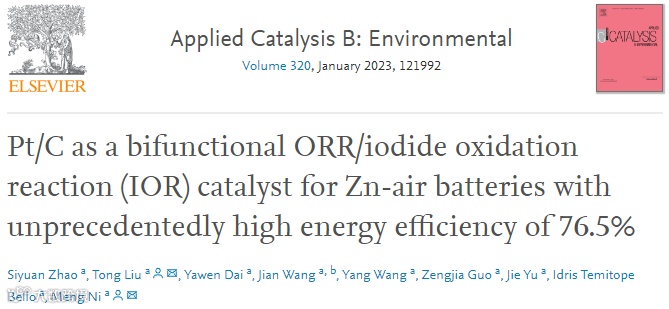 基于此,香港理工大学倪萌教授团队首次提出双功能ORR/IOR催化剂的概念,并通过理论计算和实验验证ORR基准催化剂Pt/C本身便是一种非常优异的ORR/IOR催化剂。所组装的锌空气电池在5 mA cm-2的电流密度下也显示出了1.69V的充电电压,76.5%的能量效率,以及提升了8倍的循环寿命。文章以题为“Pt/C as a bifunctional ORR/iodide oxidation reaction (IOR) catalyst for Zn-air batteries with unprecedentedly high energy efficiency of 76.5%”发表于国际知名期刊Applied Catalysis B: Environmental。