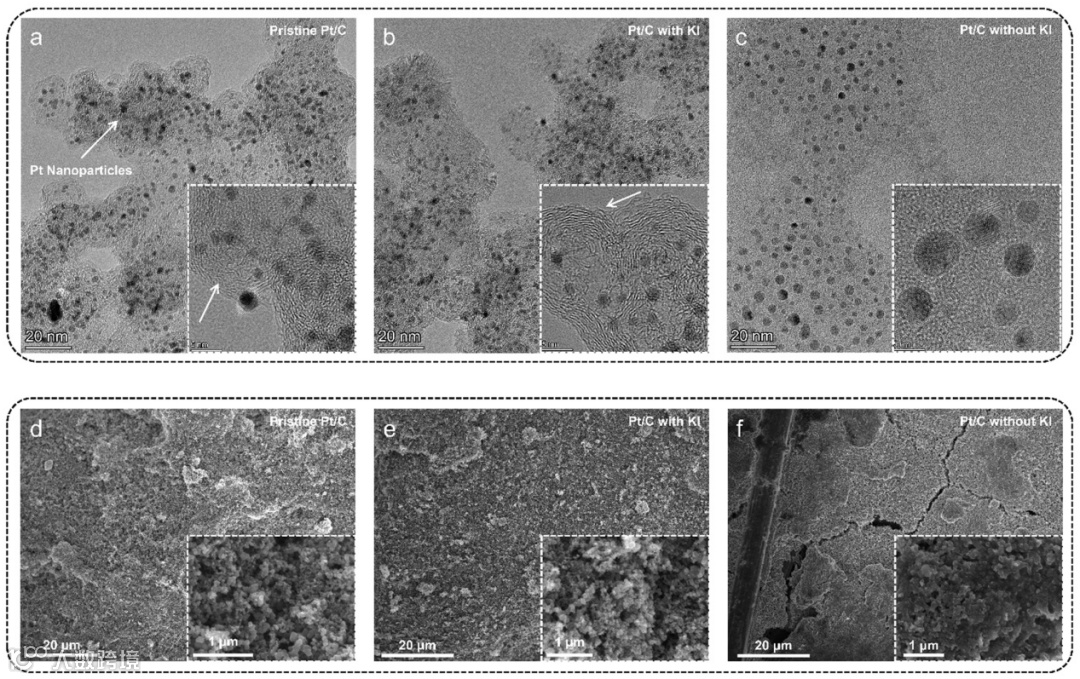 图5. 初始、有KI循环后和无KI循环后的Pt/C电极的TEM和SEM图像