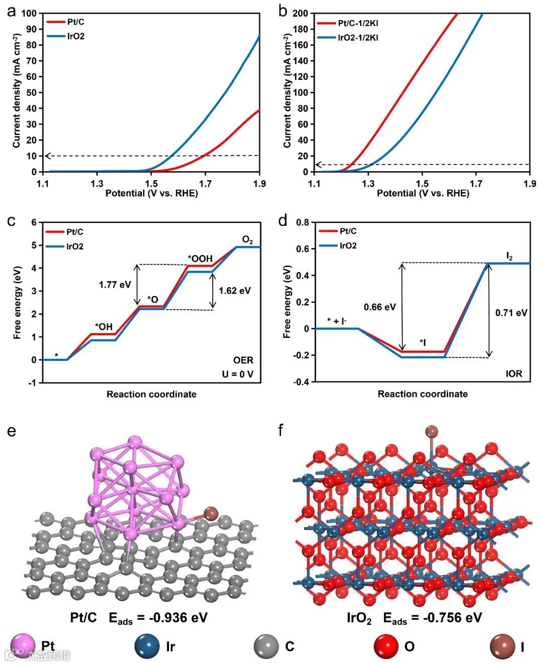 图3. Pt/C和IrO2的自由能图谱以及对于碘离子的吸附能