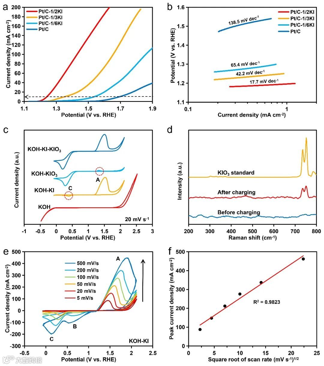 Pt/C是一种ORR性能非常好但OER性能非常差的催化剂。但在KOH溶液中加入KI后,Pt/C的起始氧化电位大大降低,且通过原位显微镜观察到Pt/C电极表面并未有气泡生成,说明IOR替代了OER反应。拉曼图谱验证了碘离子氧化的最终产物为碘酸根离子。CV曲线中碘的氧化峰A显著大于还原峰C,暗示碘的氧化反应是一个电化学-化学过程,高扫速下B峰的出现说明碘离子的氧化过程是先氧化为碘单质,碘单质在碱性溶液中迅速歧化为碘离子和碘酸根离子。
