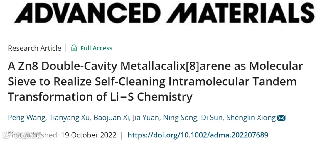 基于此,来自山东大学的熊胜林教授、孙頔教授与奚宝娟教授合作,在国际知名期刊Advanced Materials上发表题为“A Zn8 Double-Cavity Metallacalix[8]arene as Molecular Sieve to Realize Self-Cleaning Intramolecular Tandem Transformation of Li−S Chemistry”的观点文章。