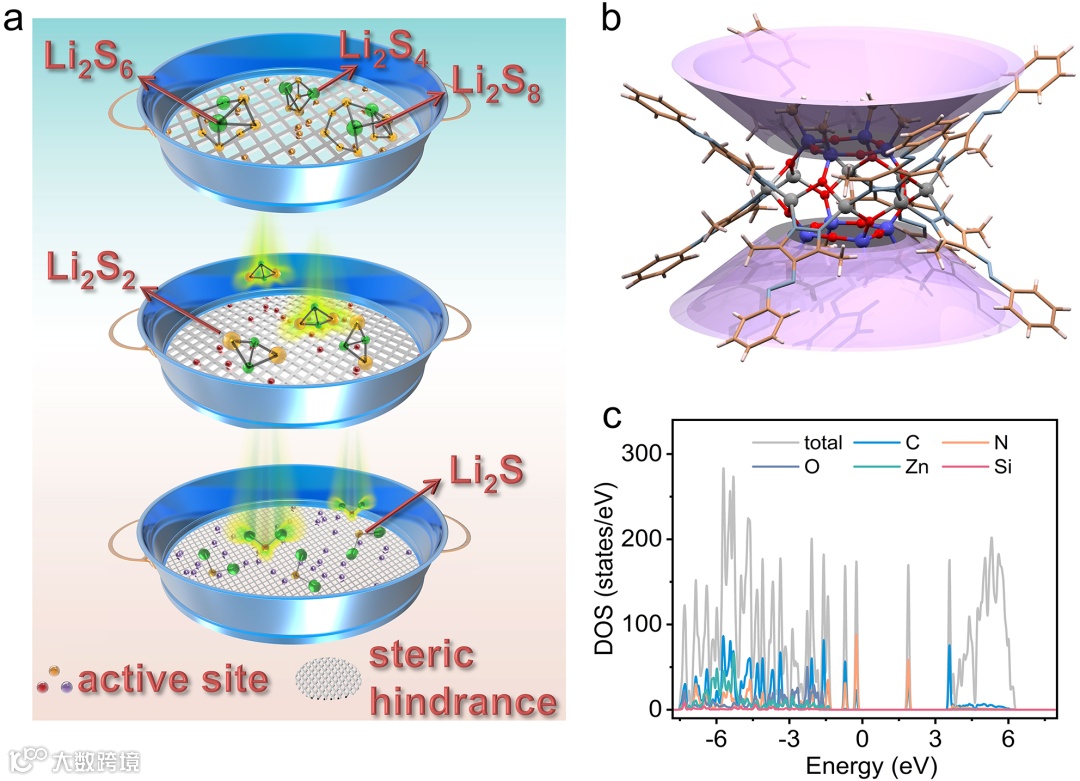 图1. 多硫化锂在Zn8分子内部的接力式转化机理示意图,及Zn8分子的结构和电子状态。
