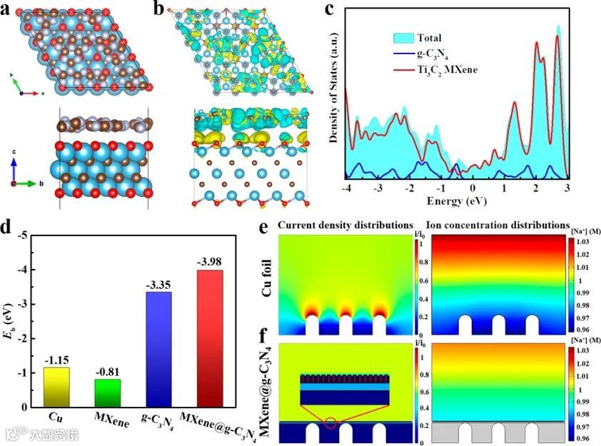 作者通过第一性原理计算与有限元分析对Ti3C2 MXene@g-C3N4纳米复合材料的界面性质进行了模拟。差分电荷密度图显示电子在Ti3C2 MXene@g-C3N4异质界面处发生了重排,能够促进钠离子在界面的选择性吸附和成核。根据态密度图可以看出,与g-C3N4相比,Ti3C2 MXene@g-C3N4纳米复合材料在费米能级附近拥有更高的占据态,这与优异的电子传递性能有关。