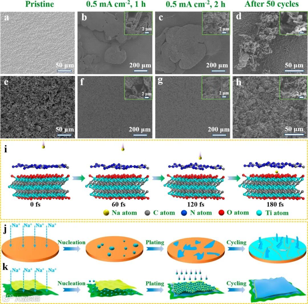 作者采用SEM表征了不同电流密度和面积容量下的钠金属沉积/剥离行为,Ti3C2 MXene@g-C3N4基体的钠金属沉积层光滑、平坦,无枝晶形成,基体的结构由蓬松逐渐变得致密,整体形态保持完整,表明了钠金属在Ti3C2 MXene@g-C3N4电极上实现了均匀无枝晶沉积。尤其是不同基体上钠沉积的截面SEM图直观地证明了Ti3C2 MXene@g-C3N4对钠金属在循环中巨大体积变化的抑制作用。此外,从头算分子动力学模拟了钠离子快速通过g-C3N4层的能力(图4i)。