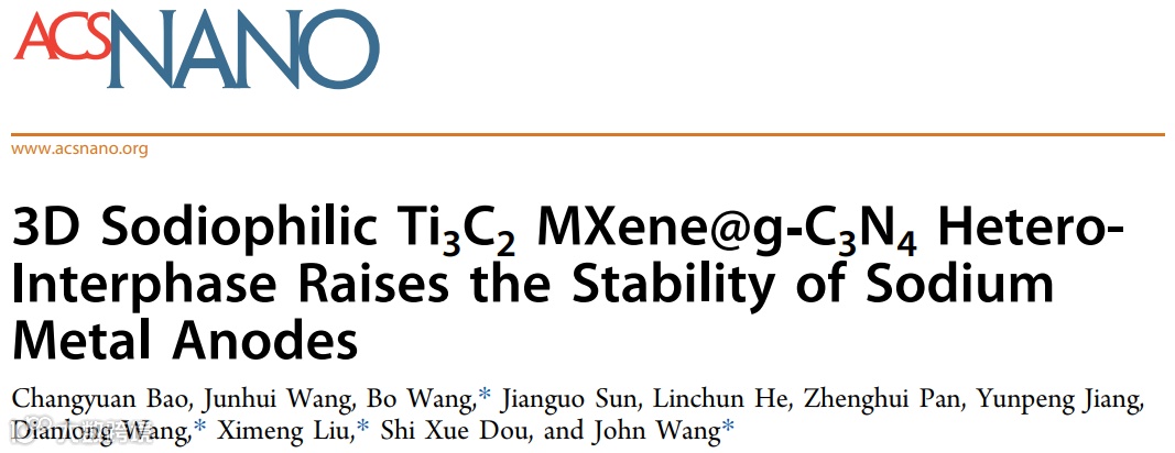 基于此,来自哈尔滨工业大学的王博副教授、王殿龙教授与新加坡国立大学的刘西蒙博士、John Wang教授合作,在国际知名期刊ACS Nano上发表题为“3D Sodiophilic Ti3C2 MXene@g-C3N4 Hetero-Interphase Raises the Stability of Sodium Metal Anodes”的研究性文章。