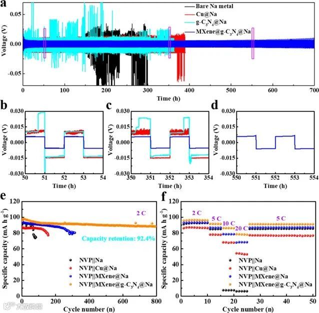 为了验证Ti3C2 MXene@g-C3N4基体的高可逆性,测试了半电池的循环稳定性。在0.5 mA cm-2,1 mA h cm-2条件下循环400次的平均库伦效率为99.9%(图6b)。对称电池在1 mA cm-2,1 mA h cm-2条件下具有长期稳定性(高达700 h)和较低的电压滞后(11 mV)。以Na3V2(PO4)3为正极、各种基体为负极来组装全电池,并在2 C倍率下测试长期循环稳定性。在800次循环后,Na3V2(PO4)3||Ti3C2 MXene@g-C3N4@Na电池的容量保持率为92.4%(图6e)。此外,全电池也具有出色的倍率性能(高达20 C,图6f)。