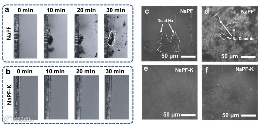 图3 分别在(a)NaPF和(b)NaPF-K电解液中,在0.8 mA cm-2电流下,Na在负极表面沉积过程的原位光学显微镜图像;在NaPF电解液中循环10次后的(c)隔膜和(d)Na金属负极表面的光学图像;在NaPF-K电解液中循环10次后的(e)隔膜和(f)Na金属负极表面的光学图像。