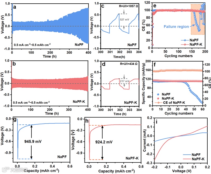 图1 对称电池在(a)NaPF和(b)NaPF-K电解液中的电化学性能;对称电池循环300h在(c)NaPF (d)NaPF-K电解液中的电化学性能放大图;(e)非对称电池在NaPF和NaPF-K电解液中的库伦效率;(f) Na||NVP全电池在NaPF和NaPF-K电解液中的循环性能;(g) 钠离子在NaPF和(h)NaPF-K电解液中的成核过电位;(i) 对称电池在NaPF和NaPF-K电解液中的i-v曲线。