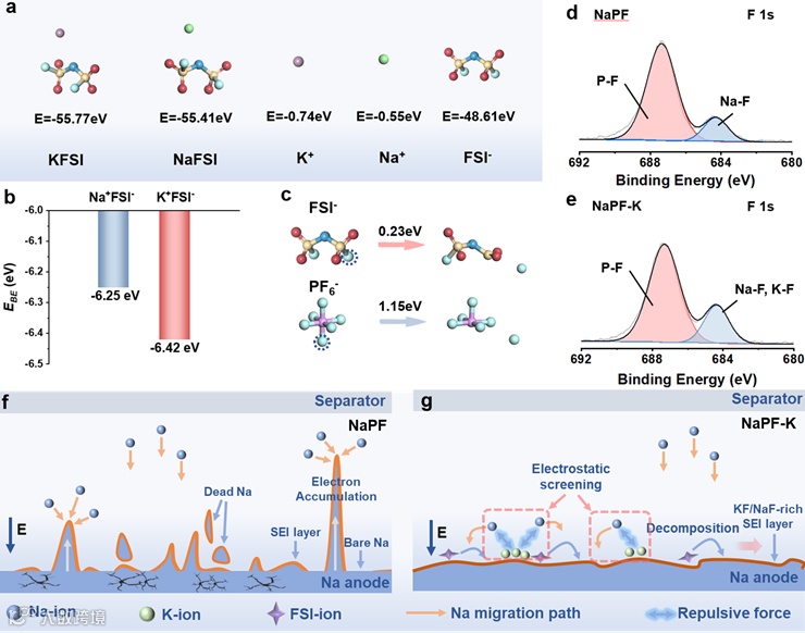图4 (a)KFSI、NaFSI、K+、Na+、FSI-的模型及相应的基态能量;(b)K+-FSI-和Na+-FSI-的结合能;(c)钠负极表面来自FSI-的S-F键的断裂能和来自PF6-的P-F键的断裂能;(d)分别在NaPF和(e)NaPF-K电解液中循环20次后,钠金属负极表面SEI膜的F 1s XPS谱;(f) NaPF电解液和(g)NaPF-K电解液在Na沉积过程中的钠金属负极表面形貌示意图。