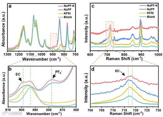 图2 (a)空白电解液、KFSI电解液、NaPF电解液和NaPF-K电解液的FTIR光谱和(b)拉曼光谱。(c)和(d)分别是(a)和(b)的部分特征峰的放大图像。