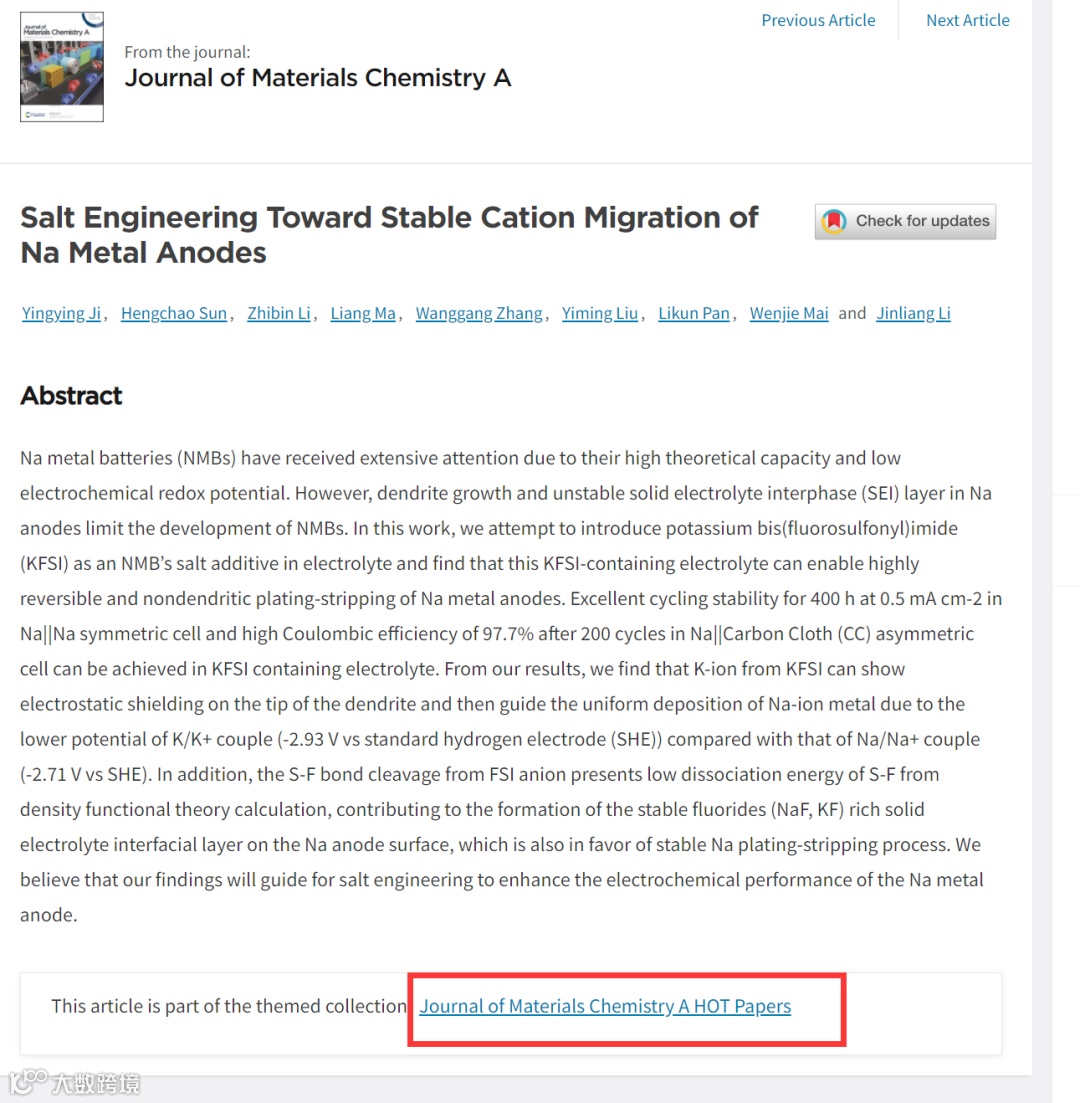 基于此,来自暨南大学的黎晋良副研究员与马良博士,在国际知名SCI期刊Journal of Materials Chemistry A上发表题为“Salt Engineering Toward Stable Cation Migration of Na Metal Anodes”的研究论文,文章第一作者为暨南大学硕士研究生计莹莹。