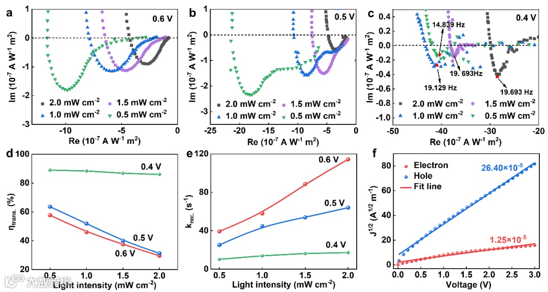 图2. (a-c)二元有机本体异质结光阴极不同光照强度及不同电位下的强度调制光电流谱,(d-e)计算得到的电荷转移效率、电荷复合速率,(f)光阴极空穴及电子迁移率比较。