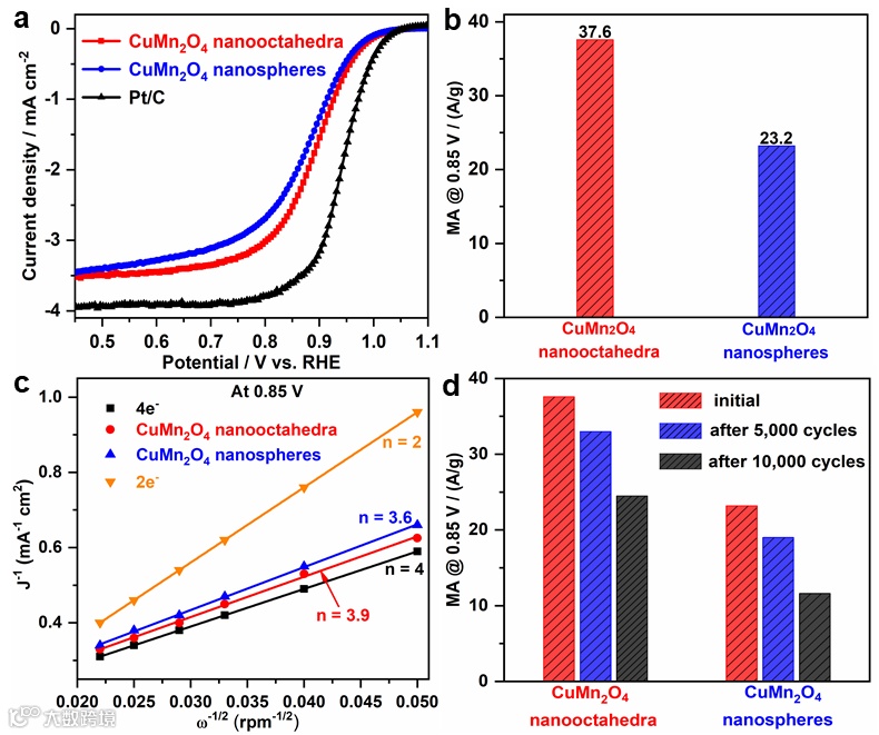 不同暴露晶面的CuMn2O4尖晶石纳米晶体在碱性介质进行ORR性能的系统测试,结果表明,在0.85 V的电压下八面体的比质量活性高达37.6 A/g,是球形纳米晶体的1.62倍,而且八面体较球体具有更高的电化学活性面积与催化稳定性,其稳定性也优于目前商用化的Pt/C催化剂。通过一系列在不同转速下的ORR极化曲线测试,证实了八面体在ORR反应中的电子转移数为3.9,类似于商用化Pt/C的4电子过程,高于球形的电子转移数(3.6),揭示了暴露{101}晶面八面体催化剂高活性的本质。