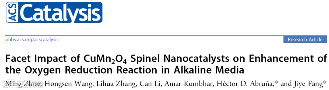 基于此,来自纽约州立大学宾汉姆顿分校的Jiye Fang教授与康奈尔大学的Héctor D. Abruña教授合作,在国际知名期刊ACS Catalysis上发表题为“Facet Impact of CuMn2O4 Spinel Nanocatalysts on Enhancement of the Oxygen Reduction Reaction in Alkaline Media”的研究性文章。