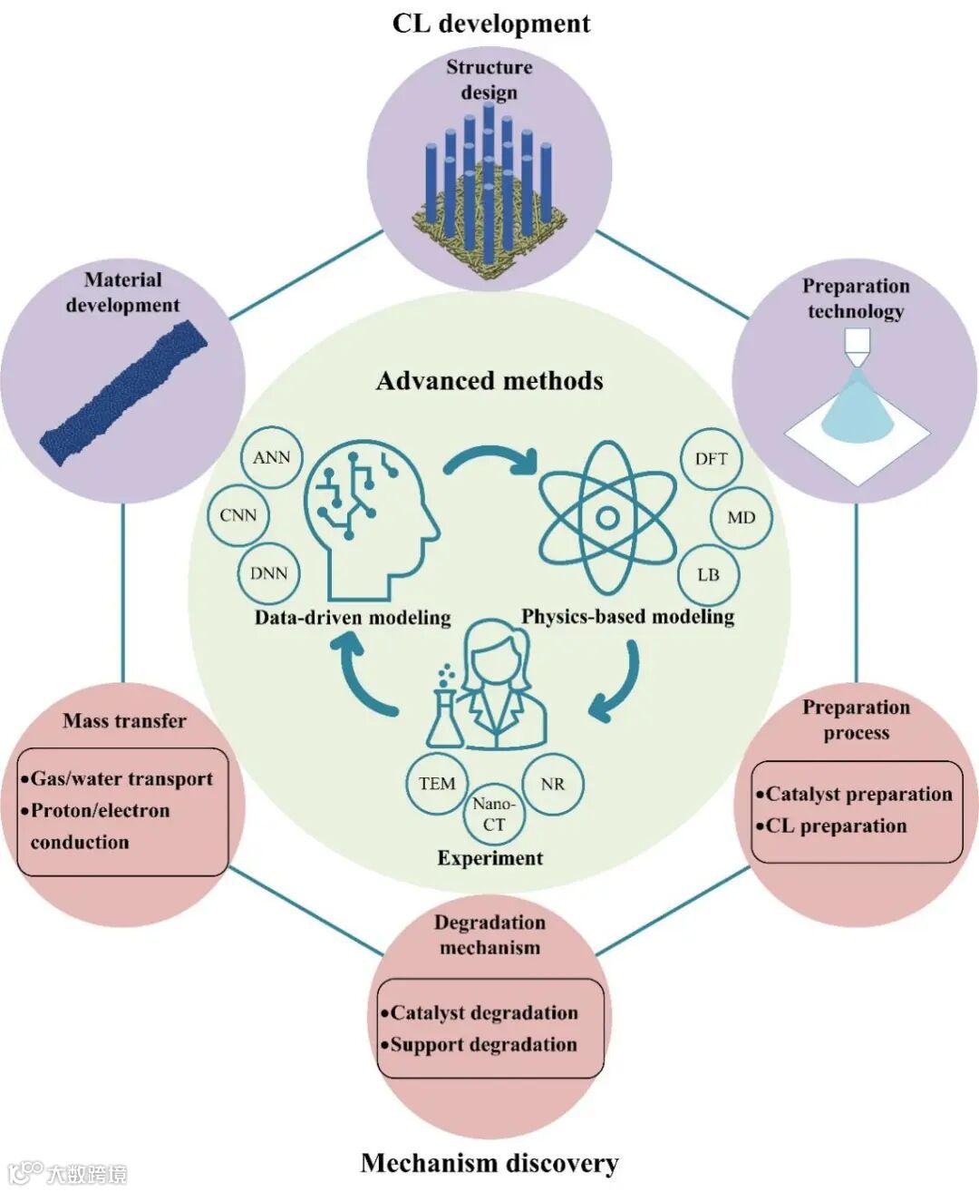 此外,模拟技术(如:DFT、MD、LB)也经常用于分析催化层结构特征和传输特性。考虑到催化层开发的复杂性,基于数据驱动的机器学习也将发挥重要作用,它可用于指导材料筛选、结构设计和制备工艺参数优化;同时,也可用于辅助多尺度仿真模型建立,从而探究催化层内的多尺度传输过程。因此,紧密结合测试技术、仿真技术和机器学习技术对于催化层开发来说至关重要。未来,为了开发超低铂燃料电池,我们需要制定一套包括材料开发、结构设计、制备技术设计和测试在内的标准开发流程。