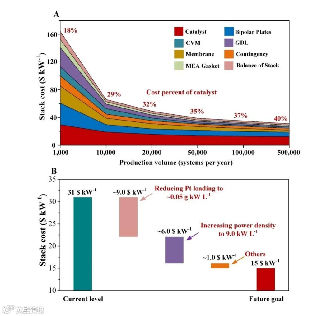 从而,燃料电池电堆的成本将降低至15 $/kW(系统成本降低至30 $/kW)。此时,质子交换膜燃料电池将完全具备成本竞争力。由于铂载量的大幅降低,燃料电池催化层反应面积较少,导致了严重的传质和衰减问题(尤其是催化层部件),这将影响它的功率密度和寿命。