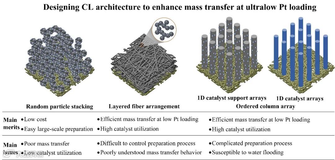 基于此,来自天津大学的焦魁教授和助理研究员樊林浩博士,在国际知名期刊Energy & Environmental Science上发表题为“Towards Ultralow Platinum Loading Proton Exchange Membrane Fuel Cells”的观点文章。该观点文章指出开发超低铂(<0.05g/kW)燃料电池可彻底解决其成本难题,探讨了超低铂燃料电池存在的传质和衰减等关键问题,提出了实现超低铂载量的具体技术路线及关键开发手段。