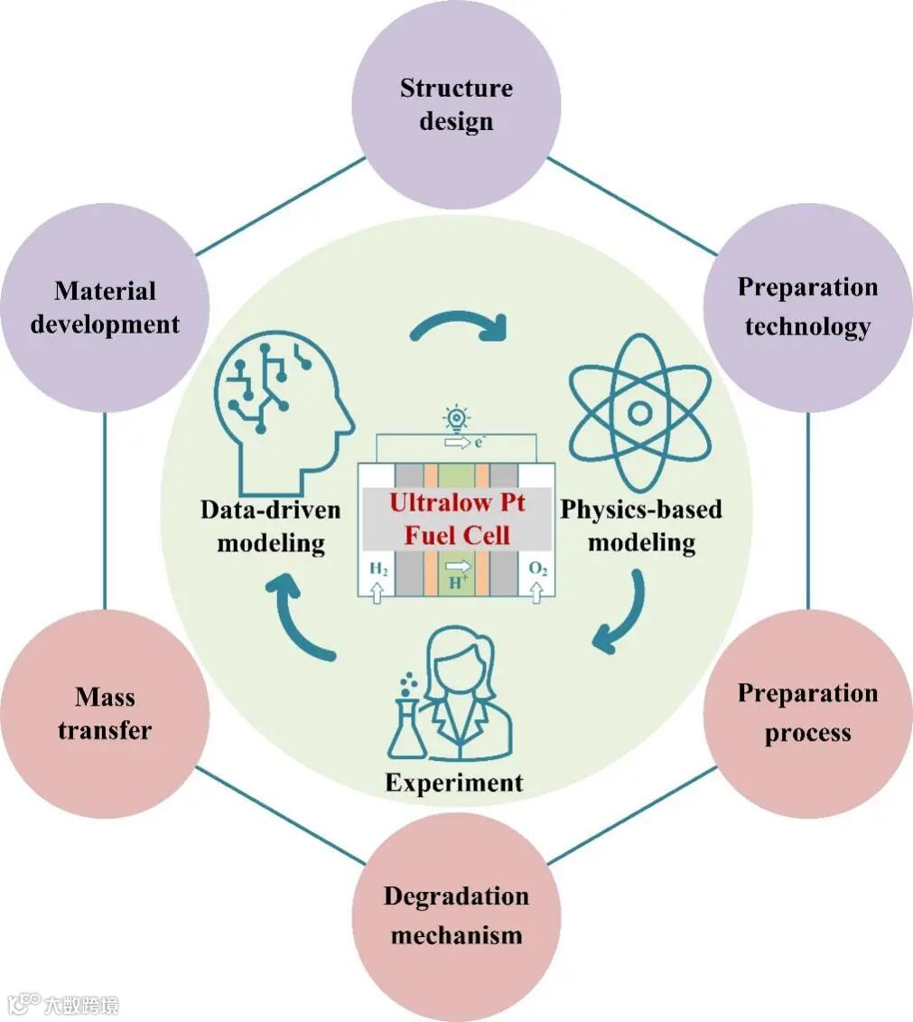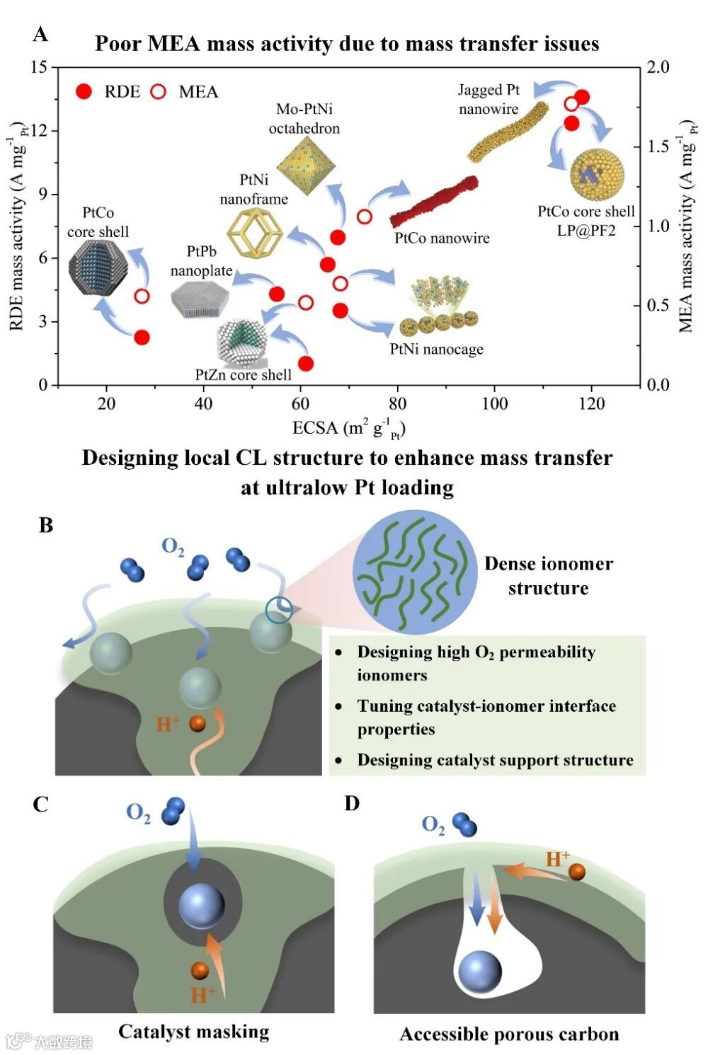燃料电池催化层包含催化剂/载体颗粒以及包覆在其表面的电解质薄膜,在催化剂周围的局部区域存在着质子、电子、反应气体和水传输现象,高的传质阻力严重降低了催化剂的质量活性。因此,需要合理设计催化层局部结构,从而促进物质传输,提升超低铂燃料电池的性能。