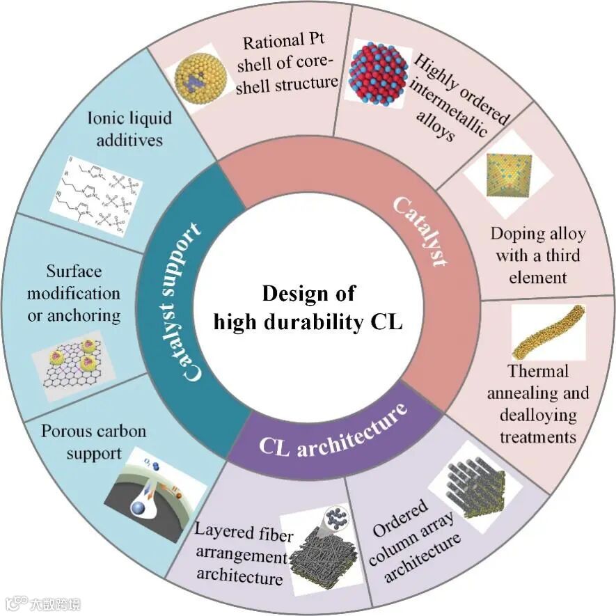 高活性催化剂设计(如:核壳结构催化剂、高度有序合金催化剂、纳米线催化剂、掺杂第三种金属的合金催化剂等)、电解质离子流体掺杂设计、载体表面修饰和催化剂锚定设计、多孔载体设计、以及新型催化层构型(纤维排布构型和柱状阵列构型)设计都将有效抑制超低铂燃料电池的衰减。