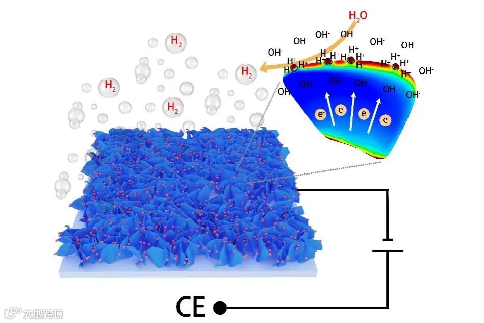 图2. 基于局部电场的边缘效应在碱性析氢反应中的示意图