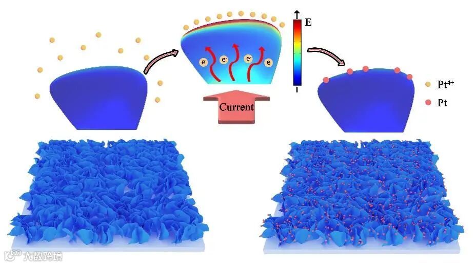 在电解水产氢的过程中,铂被认为是一种极具潜力的析氢电催化剂。然而,其在碱性介质中的应用受到H+扩散和H*解吸的限制。此外,形成具有低铂载量的有效结构催化剂仍然是一个挑战。在电场模拟的指导下,纳米片在边缘具有极强的电场分布,其边缘效应可以加快质子的扩散,有利于碱性析氢反应的进行。