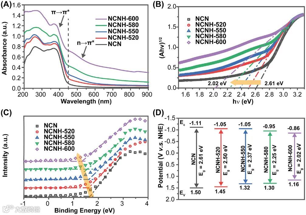 图3. A) DRS光谱,B)Kubelka–Munk函数与光子能量关系图,C)VB-XPS,和D)NCN和NCNH-X的能带结构排列。