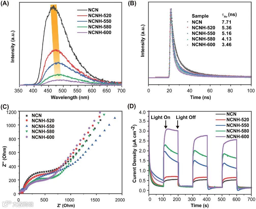 图4. A) PL谱和B)NCN和NCNH-X样品的时间分辨瞬态PL谱,C) NCN和NCNH-X样品的阻抗,D) 在可见光(λ>400 nm,300 W Xe灯)下测量的NCN和NCNH-X样品的光电流曲线。