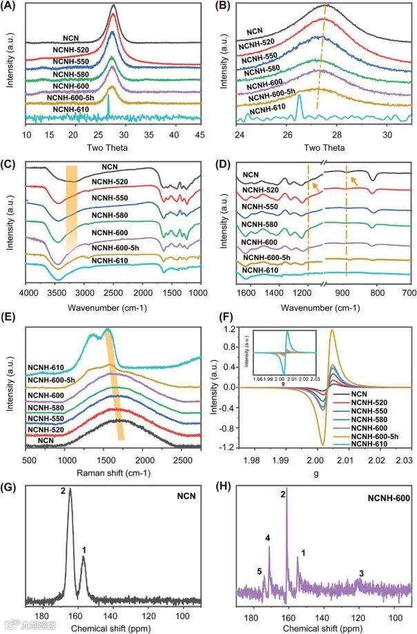 图2. A)NCN和NCNH-X(X=520、550、580、600、600–5h和610)的XRD图谱。B)(A)中22–32°的放大区域。C) 分别是NCN和NCNH-X的FT-IR光谱。(E,F)分别是NCN和NCNH-X的拉曼光谱和EPR光谱。(G,H)分别是NCN和NCNH-600的NMR谱。