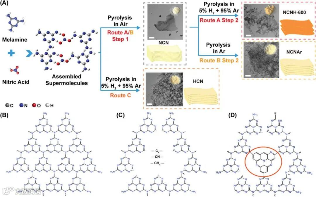基于此,该论文采用两步热解法制备了具有扩展π-共轭的超薄2D g-CNx纳米片。首先,第一步通过酸辅助剥离获得的纳米片提供了相对较大的比表面积,继而,在H2/Ar混合气中的热解可通过去除胺基和氮原子产生扩展的π-共轭结构,并进一步剥离g-CNx纳米片。