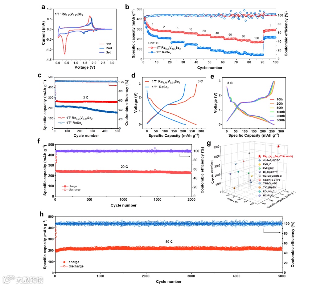 图3c显示了1T' Re0.75V0.25Se2和1T' ReSe2在3C时的循环性能。1T' Re0.75V0.25Se2负极在1.5 C时的初始充放电容量为385.3/420.6 mAh g-1,初始库伦效率(ICE)为91.6%。不可逆的容量很可能是由SEI层的形成造成的。尽管如此,CE迅速上升到100%,并且在循环后容量保持稳定。1T' Re0.75V0.25Se2电极在3C时表现出260 mAh g-1的可逆容量,500次循环后容量保持率为97%。