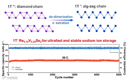 图1. 1T’’-1T’相变示意图和1T’ Re0.75V0.25Se2作为钠离子负极的循环性能