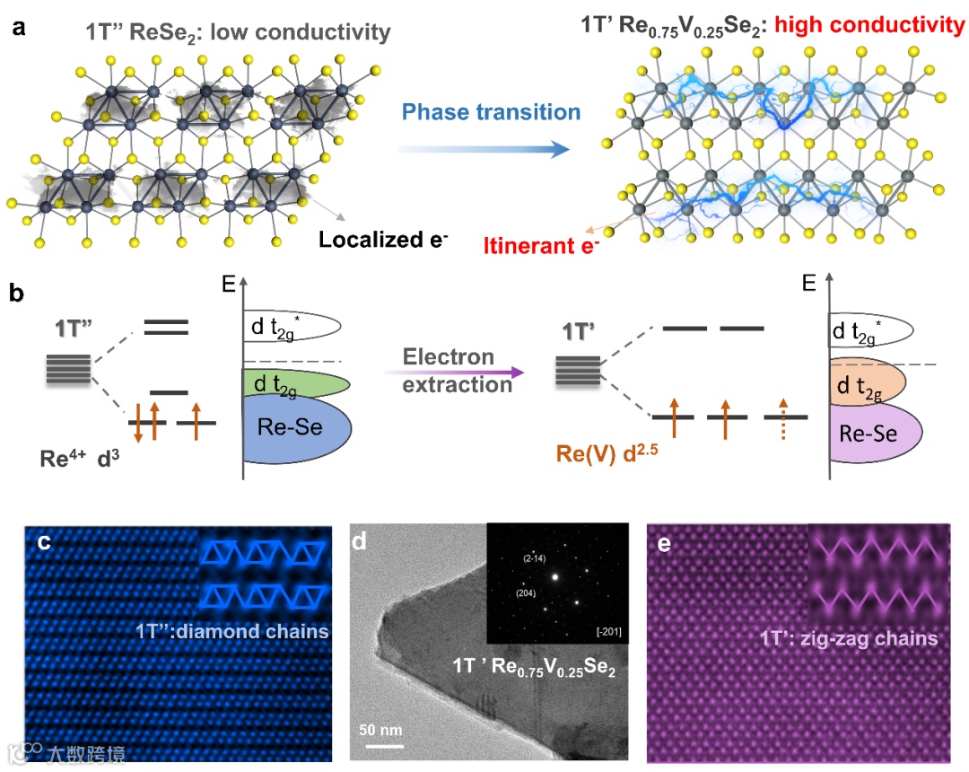 d电子数的减少导致了5d轨道劈裂模式的改变。当d电子数为2.5时,电子被填充在简并的dxy、dyz和dxz电子轨道上(图2b)。与Re4钻石链中的电子局域相比,电子可以在锯齿链中自由移动,使得1T’ Re0.75V0.25Se2具有高导电性。相关1T’’-1T’相变引起的微结构变化可由图2c-e中的电镜图看出。