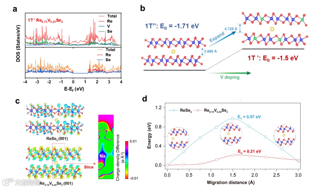 图4 1T' ReSe2和1T' Re0.75V0.25Se2态密度和对钠离子迁移能垒的理论计算