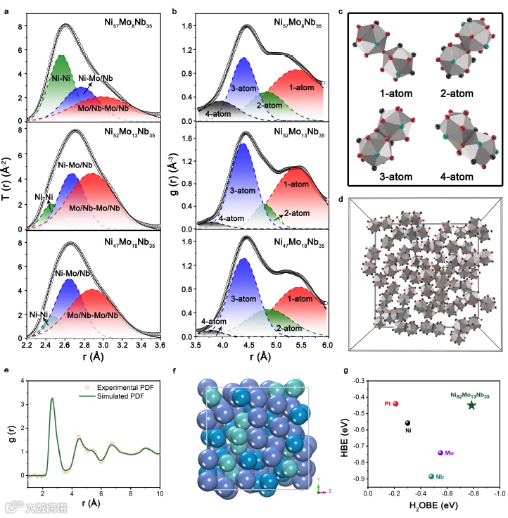 高能同步辐射测试结果表明,原子尺度的团簇连通模式为非晶态结构的稳定性和高活性提供了重要保障。短程序团簇间占比更大的点连接及线连接模式使得Ni52Mo13Nb35金属玻璃在原子尺度上具有更丰富的反应位点,分子动力学模拟与第一性原理计算结果也表明Ni52Mo13Nb35金属玻璃具有更优化的中间体吸附能(图3)。以上分析结果从理论上给出了Ni52Mo13Nb35金属玻璃优异HOR催化活性的来源。