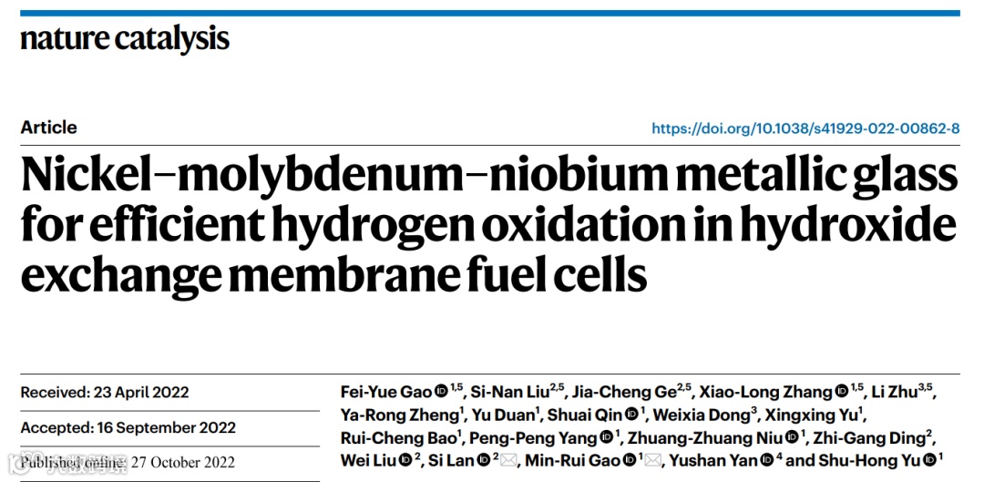 基于此,中国科学技术大学高敏锐教授团队与南京理工大学兰司教授团队合作设计开发了一种用于碱性膜燃料电池阳极氢氧化反应的三元镍-钼-铌金属玻璃结构催化剂,将镍基催化剂的耐氧化电位大幅提升,推进至与铂类似的0.8 V水平,并且达到了比肩铂金的催化活性。相关成果以“Nickel–molybdenum–niobium metallic glass for efficient hydrogen oxidation in hydroxide exchange membrane fuel cells”为题于2022年10月27日在国际著名学术期刊《自然·催化》(Nature Catalysis)上在线发表。