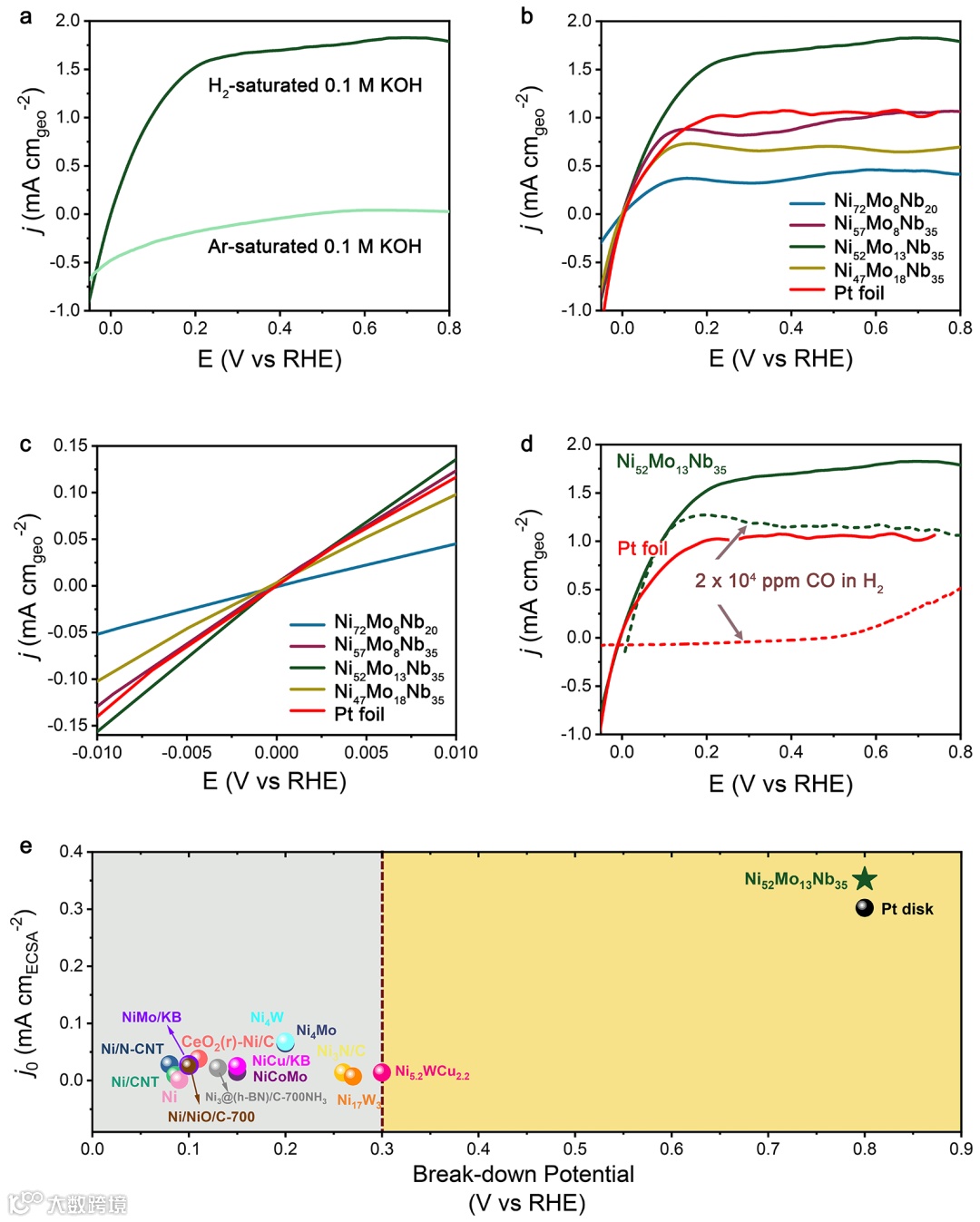 对不同样品进行电化学分析发现,Ni52Mo13Nb35金属玻璃催化剂能够达到0.8 VRHE的超高耐氧化电位,是目前非贵金属催化剂的最高值;同时,该催化剂表现出与Pt比肩的催化活性。另一方面,这种新型金属玻璃结构具有很好的抗CO毒化特性。实验结果表明,即使在氢气燃料中添加2%的CO气体,Ni52Mo13Nb35催化剂仍能表现出很高的HOR催化活性,而 Pt催化剂则完全失活(图2)。