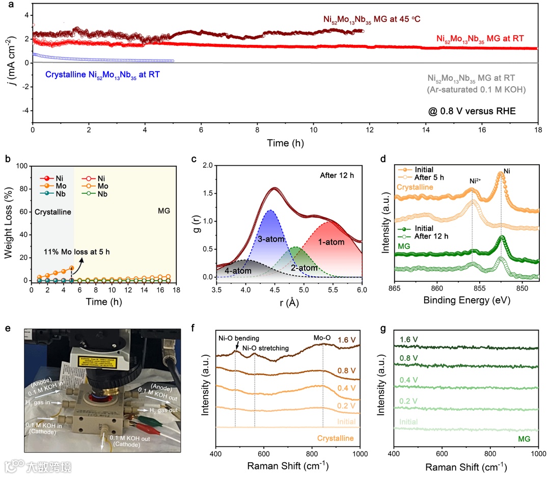 相比之下,结晶型的Ni52Mo13Nb35合金在稳定性测试5小时后就表现出Mo元素的严重损失(约11%)。原位拉曼光谱分析结果也表明,相比于结晶型催化剂,金属玻璃结构表面不容易生成氧化物种(图4)。研究人员推测,在金属玻璃的合成过程中,快速冷却使得金属玻璃具有很好的化学均一性,并且内部缺少容易引起局部腐蚀的晶体缺陷,这两个原因协同作用,实现了Ni52Mo13Nb35金属玻璃催化剂在高氧化电位下的优异稳定性。