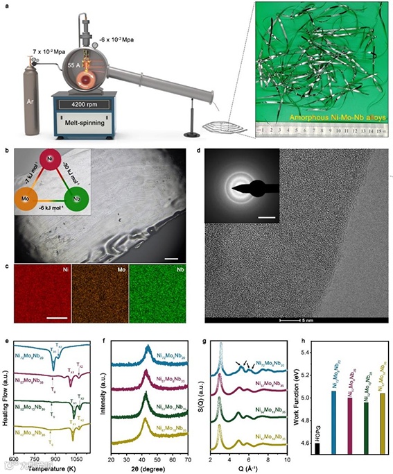 图1. NiMoNb金属玻璃条带的制备及表征。