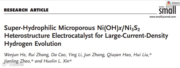 河北工业大学生态环境与信息特种功能材料教育部重点实验室刘辉副教授、赵建玲教授联合加州大学欧文分校忻获麟教授,Small: 超亲水微孔Ni(OH)x/Ni3S2异质结构电催化剂用于大电流密度析氢