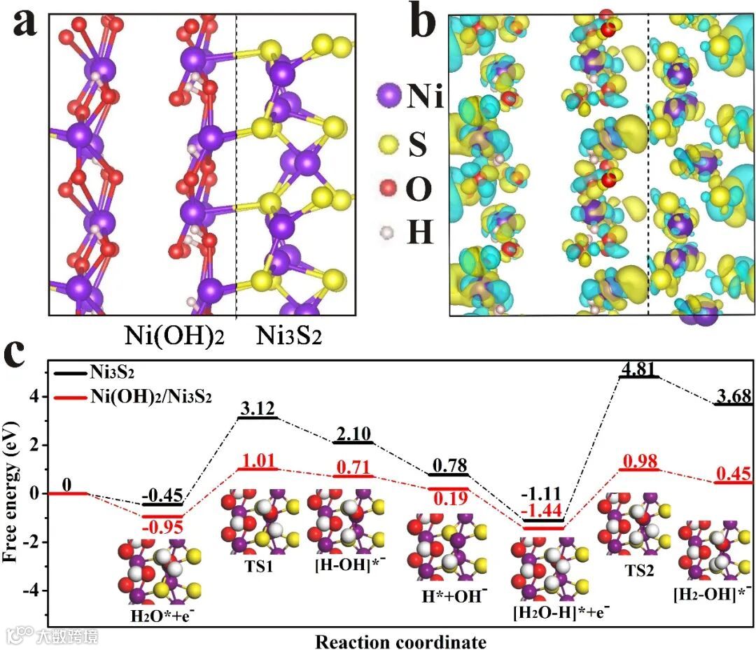 图 4 Ni(OH)2/Ni3S2的(a)结构模型和(b)差分电荷密度;(c) Ni3S2和Ni(OH)2/Ni3S2的相对能量分布图(TS过渡状态)。